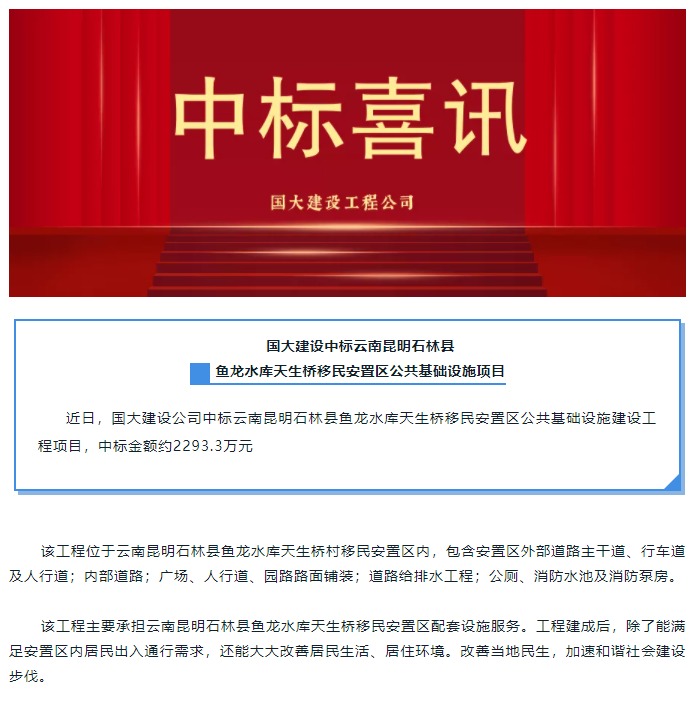 【中标!】国大建设中标云南昆明石林县鱼龙水库天生桥移民安置区公共基础设施项目